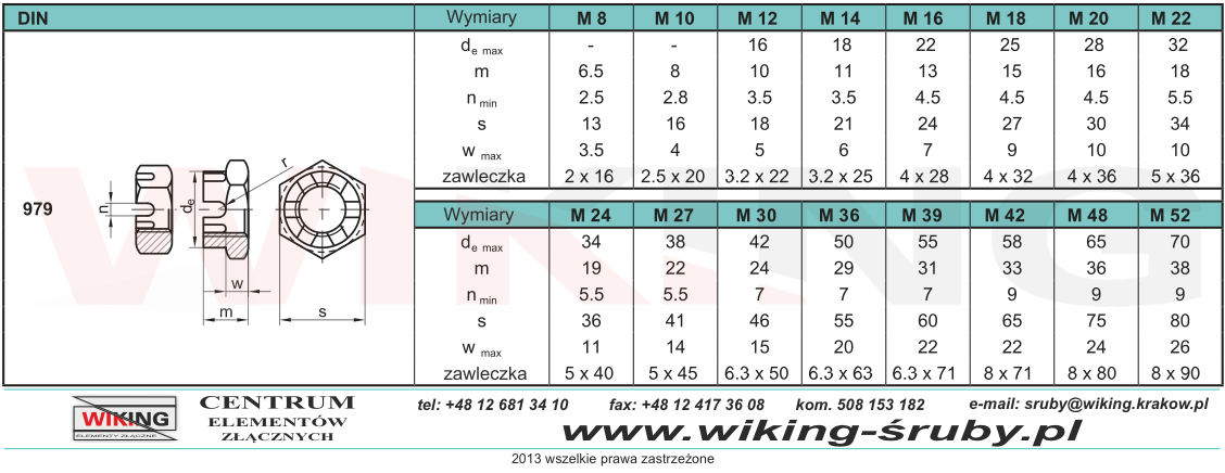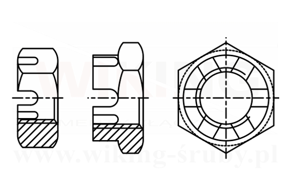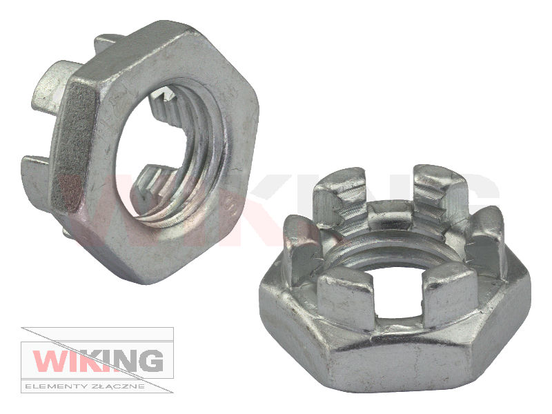 Nakrętki sześciokątne koronowe niskie DIN 979 (~DIN 937, ~ISO 7038) – wszędzie tam, gdzie nakrętka musi być zabezpieczona zawleczką