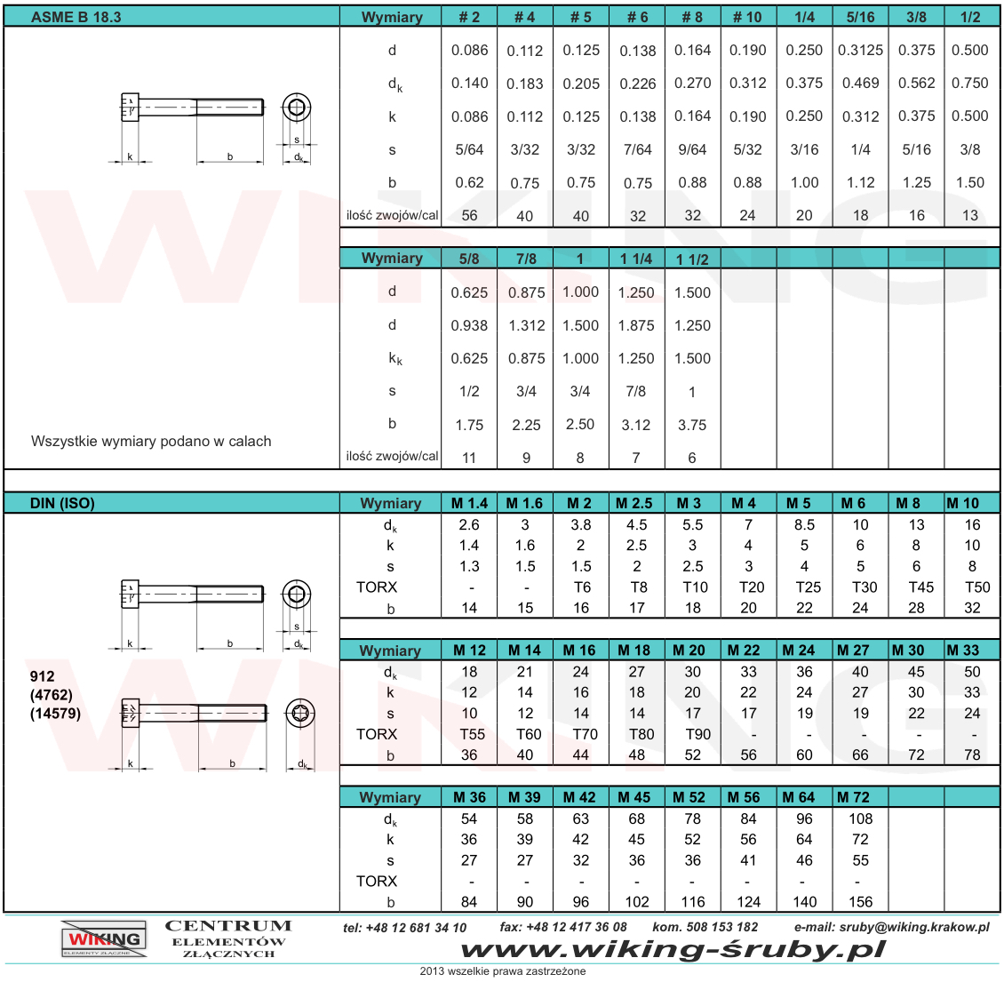| calowy UNC | stal | Grade ASTM A574 (≈ 12.9) | bez powłoki | UNC1/2" | 2" (51) | |